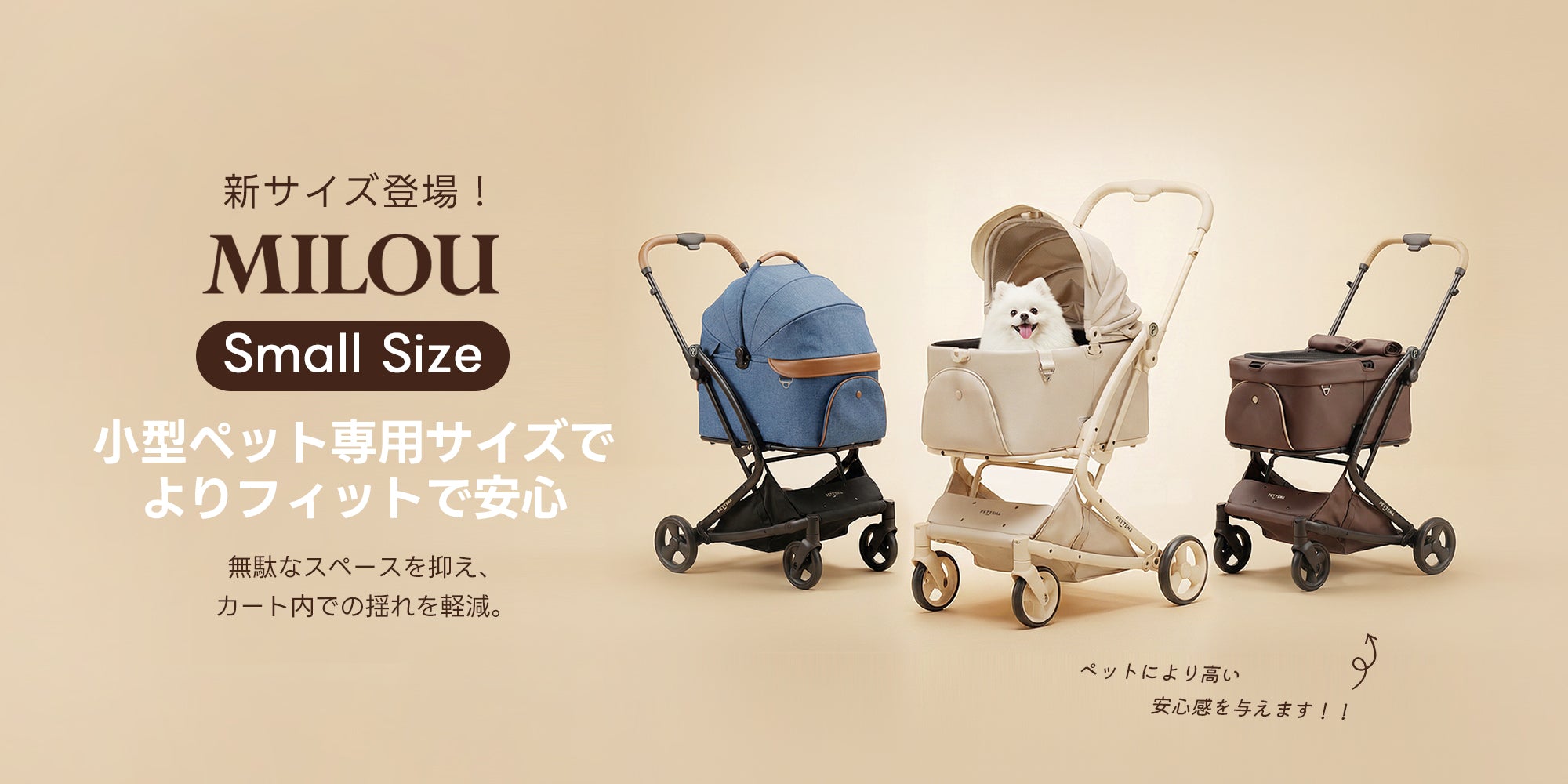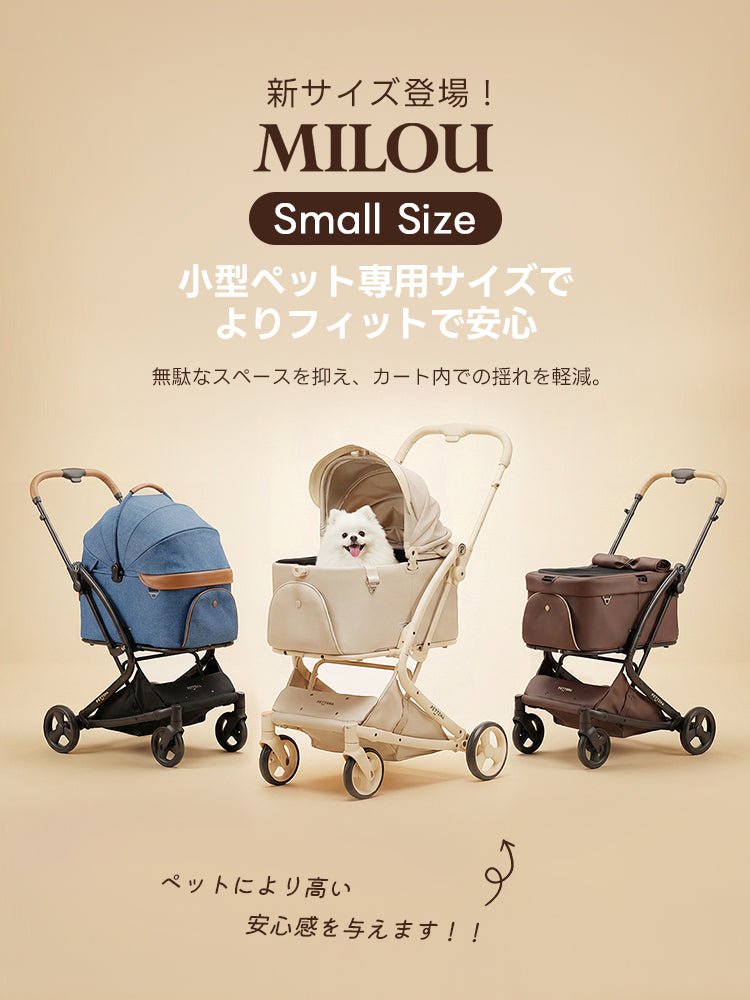 MILOUは、日本初のワンタッチで完全に折りたためる分離型のペットカートです。 フレームとキャリーコットを別々に収納する手間がなく、どこでもスムーズに折りたたみ&展開が可能。 ペットとの旅行もまるでお散歩のような気軽さで、愛犬・愛猫とのお出かけをもっと自由に楽しめます。