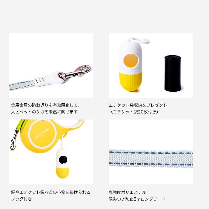 5. 細部までこだわり抜いたデザイン:金属金具の跳ね返りを有効阻止して、人とペットのケガを未然に防げます。鍵やエチケット袋などの小物を掛けられるフック付き。エチケット袋収納をプレゼント(エチケット袋20枚付き)。