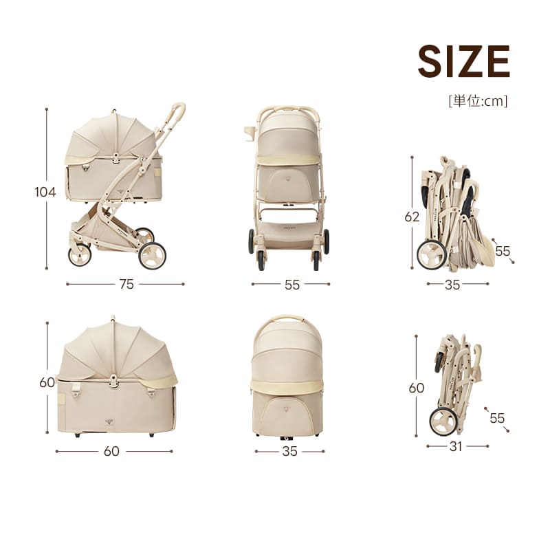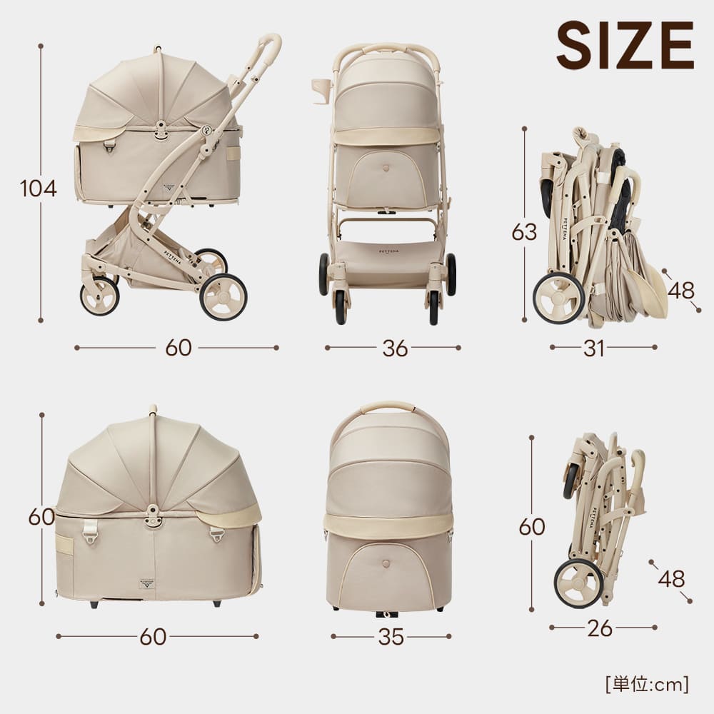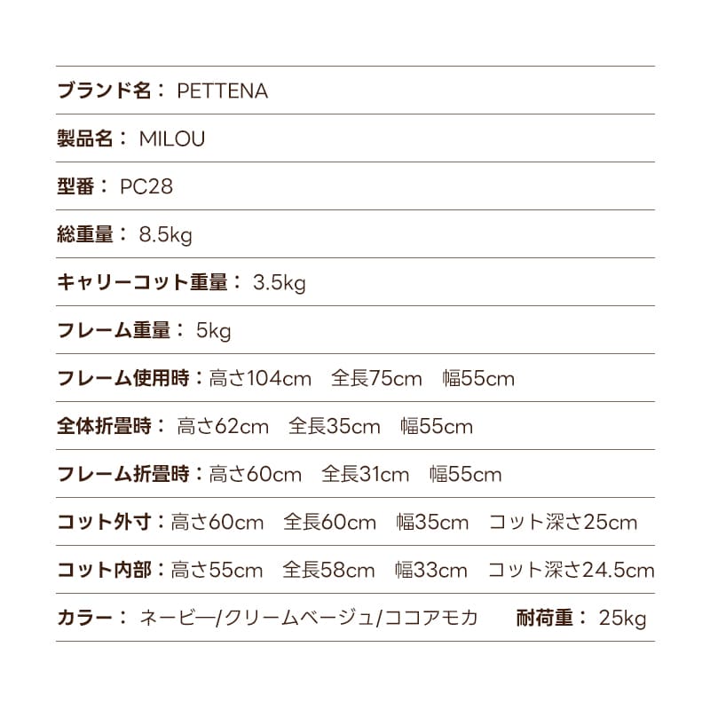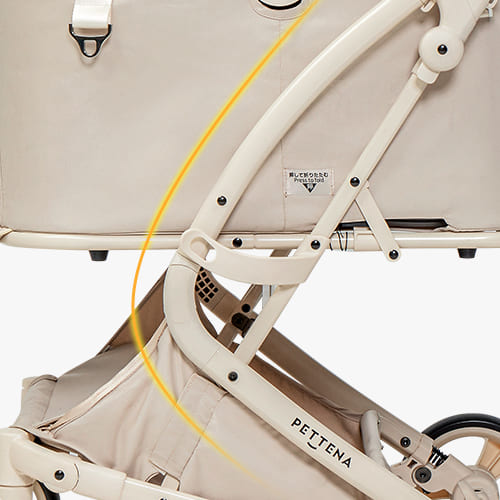 MILOUは日本初のキャリーコットごとワンタッチで折りたためる分離型モデルです。1秒で折りたたみ、1秒で展開できるので、急いでいるときでも扱えます。さらにPETTENAシリーズの中で最上位にあたり、安定性と乗り心地を重視した設計。