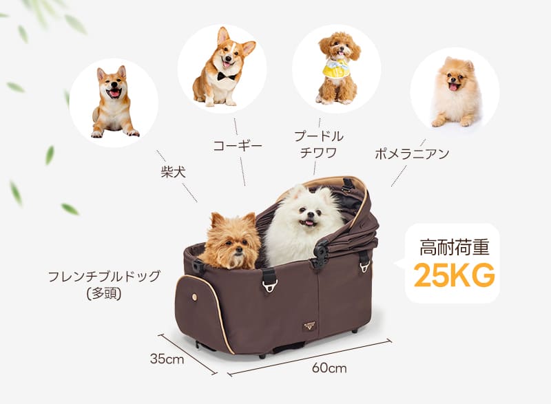 コーギーや柴犬、ビーグルなど10kgを超える中型犬種やポメラニアン、プードル、チワワなど小型犬種に対応。2頭でフィットするサイズ感。