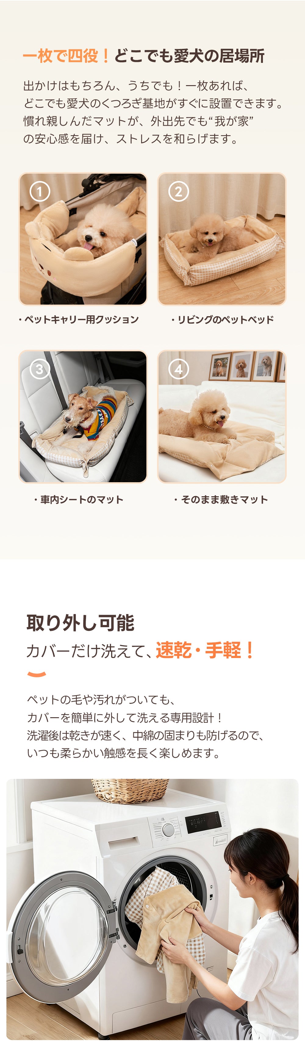 これ一枚で、移動中や旅行先など、どこでも愛犬の居場所を提供します。ペットカート内だけでなく、お出かけ先のカフェや公園でも使えるため、愛犬が常に安心できる場所を確保できます。